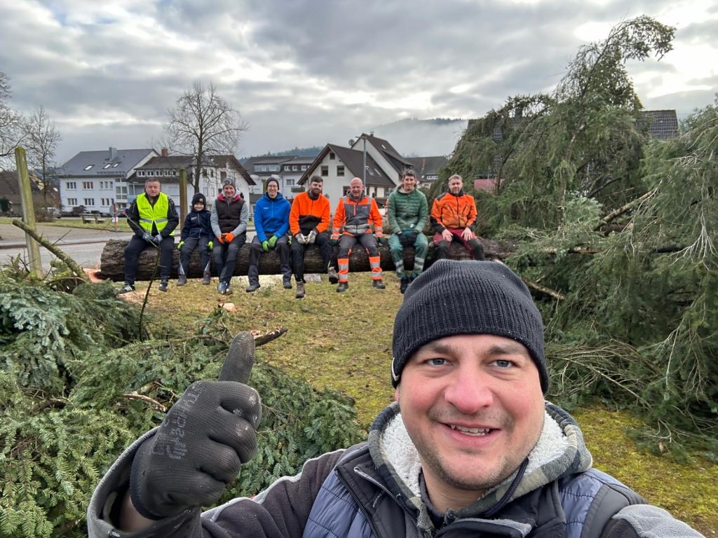 Die Helden des Arbeitseinsatzes sitzen wie die legendären New Yorker Skyscraper-Bauarbeiter auf dem gefällten Stamm…