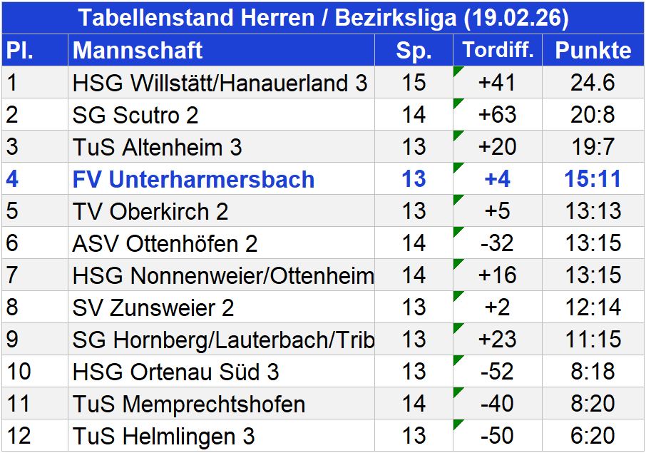 Dies änderte sich mit Einwechslung von Geheimwaffe Daniel Frohne. Zunächst blockte er unzählige Würfe der bisherigen Goalgetter der Hausherren (Johannes Golla und Justus Fischer wären neidisch gewesen), anschließend zimmerte er vorne noch fünf Buden in den Winkel. Eine am Ende sehr homogene Angriffsleistung des FVU endet in einem souveränen, aber mit viel Härte erkämpften 25:33-Auswärtssieg. Mit 4 von 4 Siegen seit Anfang Dezember festigten die Hombacher Holzfäller den vierten Platz und treten nun wiederum auswärts gegen den Drittplatzieren Altenheim III. Anschließend geht’s Freitag drauf direkt nach Ottenhöfen sowieso sonntags zum Heimspiel: 3 Spiele in 9 Tagen – alle gegen Teams aus der oberen Tabellenhälfte. Eine kräftezehrende Mammutaufgabe direkt nach der Fasend!